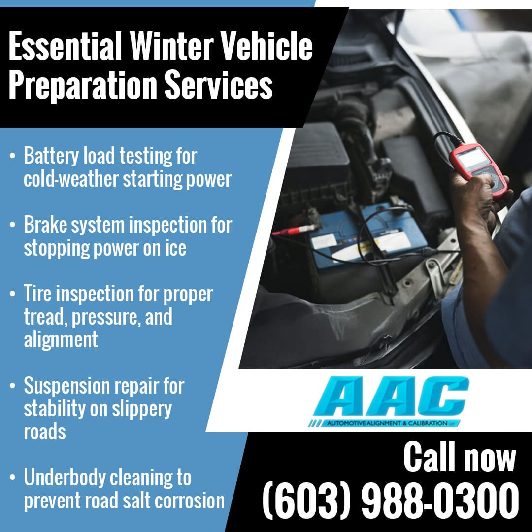 North Hampton, NH: Winter in New Hampshire brings icy roads, snow, and unpredictable weather that can affect vehicle performance and safety. Automotive Alignments & Calibrations, a trusted provider of auto repair in North Hampton, NH, offers reliable winter vehicle preparation services to help drivers stay safe on slippery roads. The shop provides routine maintenance, brake inspections, tire checks, battery testing, and emergency auto repair to maintain vehicle reliability during cold months.